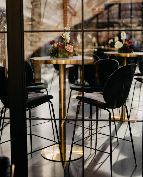 Our brass cocktail bar table with black marble top is suitable for indoor use only and is commonly hired together with our stools