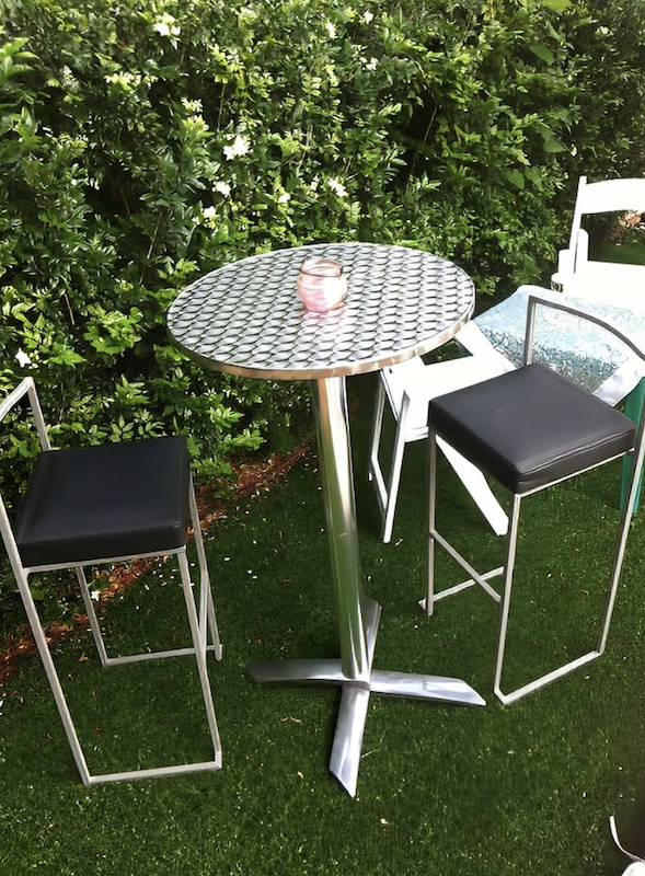 Description | Sturdy stainless-steel finish cocktail table, seats 3-4 stools around |